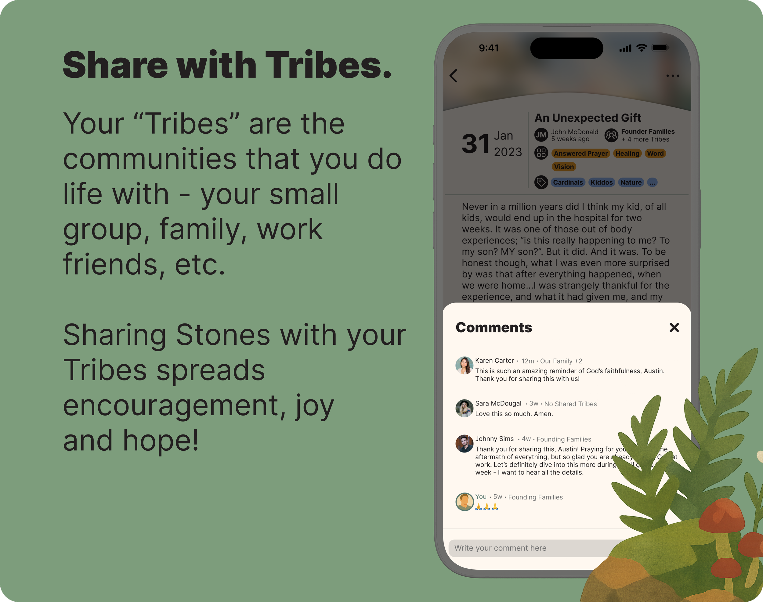 Tribes are the groups of people you do life with - these could be friends, family, your small group, etc. Creating and joining Tribes let’s you share your Stones with the people you love and do life with.