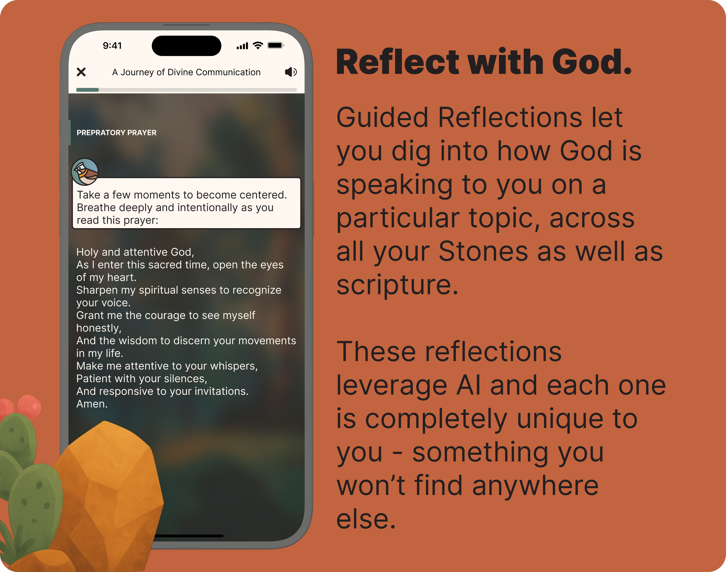 Explore the depths of how God is uniquely working in your life with one of a kind AI guided reflections.